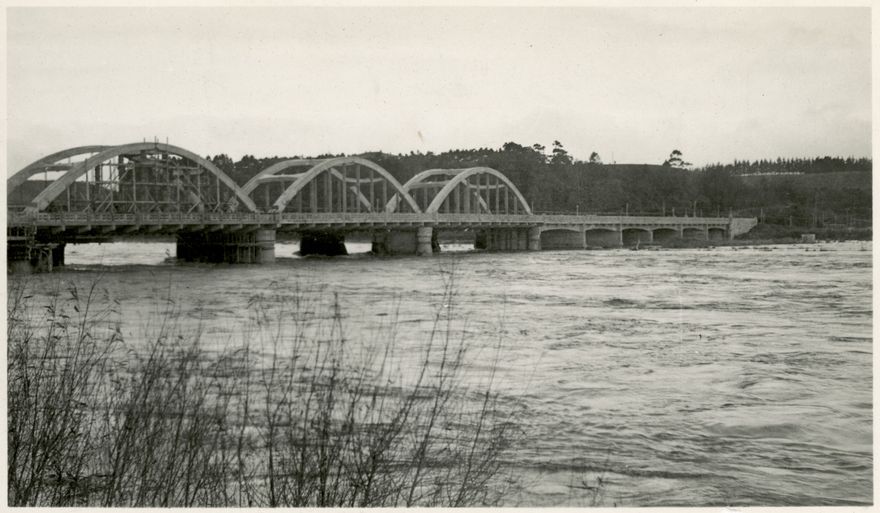 The Manawatu River appears to be in flood in this photograph. Scaffolding is still in evidence so presumably the photographs were taken just prior to the official opening in July 1935. This replaced the original structure built in 1877. It was constructed by Fletcher Construction and remained until 1986 when it proved too small for the volume of traffic, particularly as it serves the main route to Massey University.