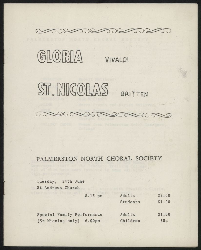 A concert programme from a performance by the Palmerston North Choral Society