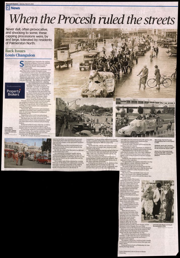 Local historians weekly "Back Issues" article in the Manawatū Standard. From 1935, Massey University capping traditions included a students procession from the University campus to Marae o Hine/The Square. Locally known as Procesh, students built floats which reflected social commentary of the day, often delivered in satirical fashion. A feature of the event was a street collection to raise funds for charities. Student behaviour during capping week became rowdier by the 1960s, resulting in criticism from the public. The last Procesh was held in 1987.