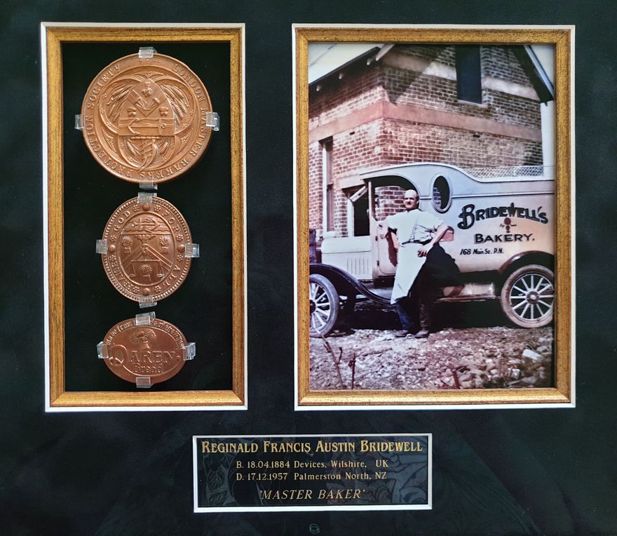 - This image shows a collection of objects pertaining to Reginald (Reg) Bridewell, Master baker, the original owner of Bridewell's Bakery. - The medals were awarded to Reg from London for Best Loaf of Bread 1919, 1921 and 1924. The photograph shows Reg with his bakery van outside the business's first address on the corner of Main Street and Victoria Avenue, around 1935. Not long after this photograph was taken, the bakery moved to 487 Main Street (later renumbered 729 Main Street, one of several Terrace End shops) where it remained operating until the 1980s.