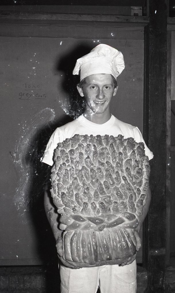 This image was taken by Frank Goldingham for Photorama pictorial magazine. Although it was housed with the April negatives, it was not published until the June edition in 1963. "Neville Bridewell holding a Harvest Loaf which he made for a church festival."