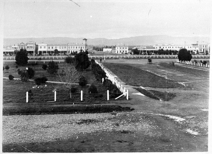 This early photograph of the Square shows the view from the corner of Rangitikei Street across to Fitzherbert Street (now Avenue). On the corner of Fitzherbert Street is the second Occidental Hotel (with the distinctive tower), the first of which was built in 1887 and burnt down in 1891. This second hotel also burnt down in 1927. On the opposite side of Fitzherbert Street is the first Bank of New Zealand built in 1878. The brick building on the far right is the Colonial Bank of New Zealand, before its conversion to the Public Library in 1900. From left, the visible businesses are: W Pegden's furniture warehouse, Frederick Ireland & Co, DM George Drapery and Fred C Hatch's store (in the same complex as the Occidental Hotel), The Occidental Hotel, Bank of New Zealand, Montague's Auction House, Colville bootmaker, unidentified building, H Wickett and Company's Cash Emporium (General Drapers and Clothiers), Attwood and Co Photography, an unidentified building and the Colonial Bank of New Zealand.