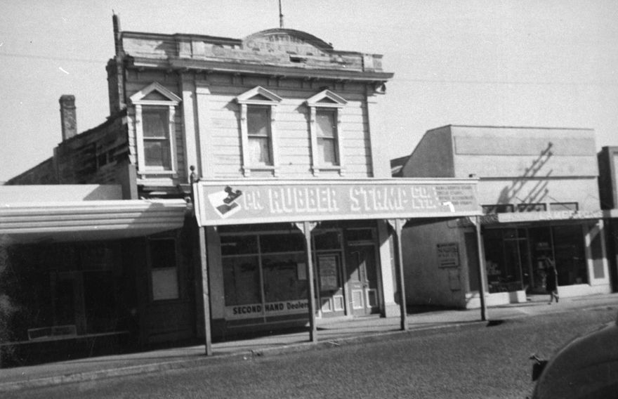 This Palmerston North building was demolished in 1968 to make way for Meredith House at 503-511 Main Street. William Thorrold-Jaggard, the photographer, was the architect of Meredith House, commissioned by Keith Garner. The Palmerston North Rubber Stamp Co Ltd which occupied this building was established by A Anderson and R D Wilson in 1962. They moved from these premises to Rangitikei Street.
