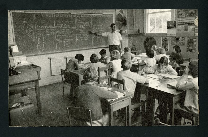 Walter Hirsch, headmaster of Aokautere School, teachers pupils in the 'old' senior classroom. He directs pupils to a lesson written on the blackboard; pupils' art works are visible on the classroom wall.