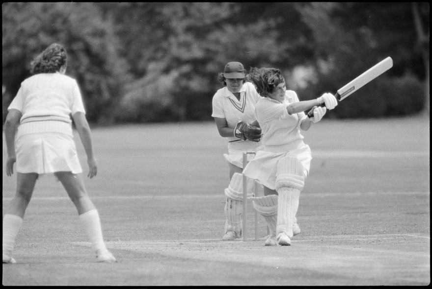Penny Kinsella at bat. This image was taken (but not used) by the Evening Standard on 19th of January 1982. It depicts Manawatū Women’s cricket team taking on the International Australian Women’s team in a limited over warm-up match for the Hansell's Vita Fresh Women's World Cup 1981/1982. The match was held at Ongley Park in Palmerston North. The Australian team won by 202 runs. The match report ‘Aussies too polished in all facets’ was written by Ford Watson and published the next day: