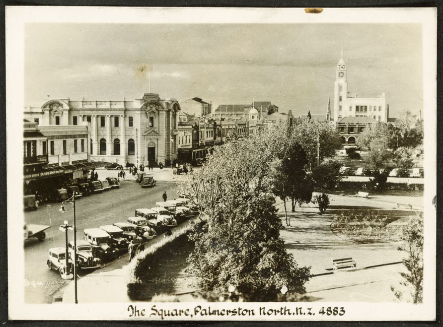 A view of The Square, overlooking the Rangitikei Street corner and down Broadway. Possibly taken from the roof of the C M Ross department store on The Square. One of a set of images of Palmerston North, produced for sale.