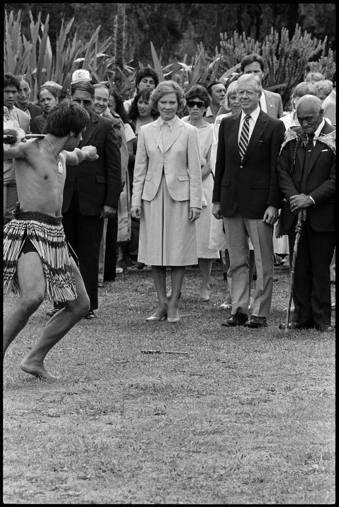 This image was taken by the Evening Standard on the 11th of February 1984 but was not published. It depicts former United States president Jimmy Carter and his wife Rosalynn during the wero at Parewahawaha Marae in Bulls.