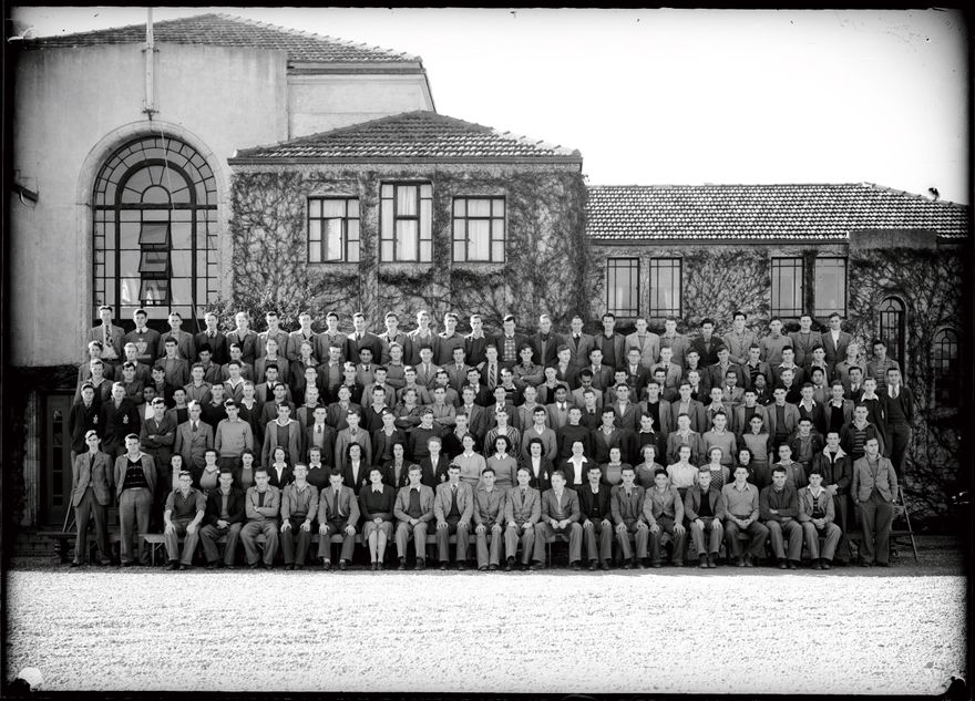 Massey Agricultural college students outside of the Refectory. Massey Agricultural College opened in 1928. The Refectory was designed by Roy A. Lippincott in the Spanish Mission / Mission Revival style. It was built in 1930 by Fletcher Construction, and opened in 1931. It was one of the original buildings on the Massey Agricultural College campus, alongside the Main Building, and housed the dining room, students' common room, kitchen and servants’ quarters. It is now used as offices.
