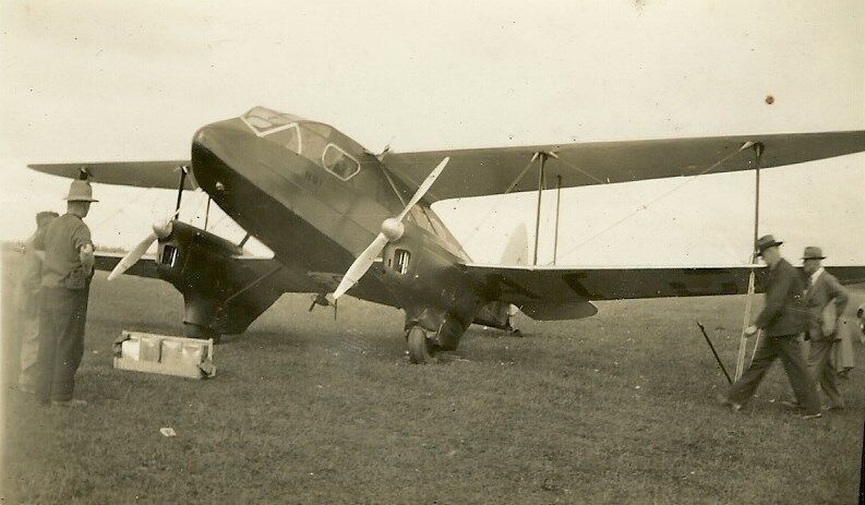 De Havilland Rapide at Milson aerodrome after it's epic flight from England to Australia as part of an International Air Race. The plane then flew on to Palmerston North, this part of the flight taking 12 hours and 9 minutes. It was the first aircraft to fly from England to New Zealand.