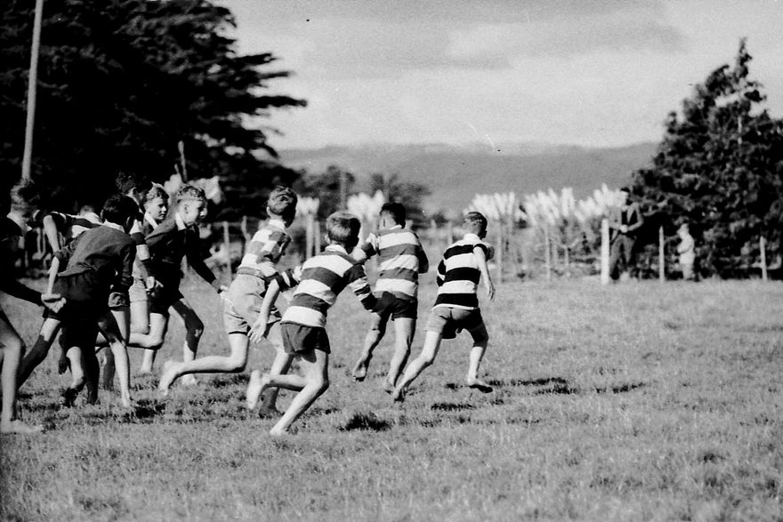 Barefoot boys playing rugby at Newbury School at an inter-school sports day, early 1960s.