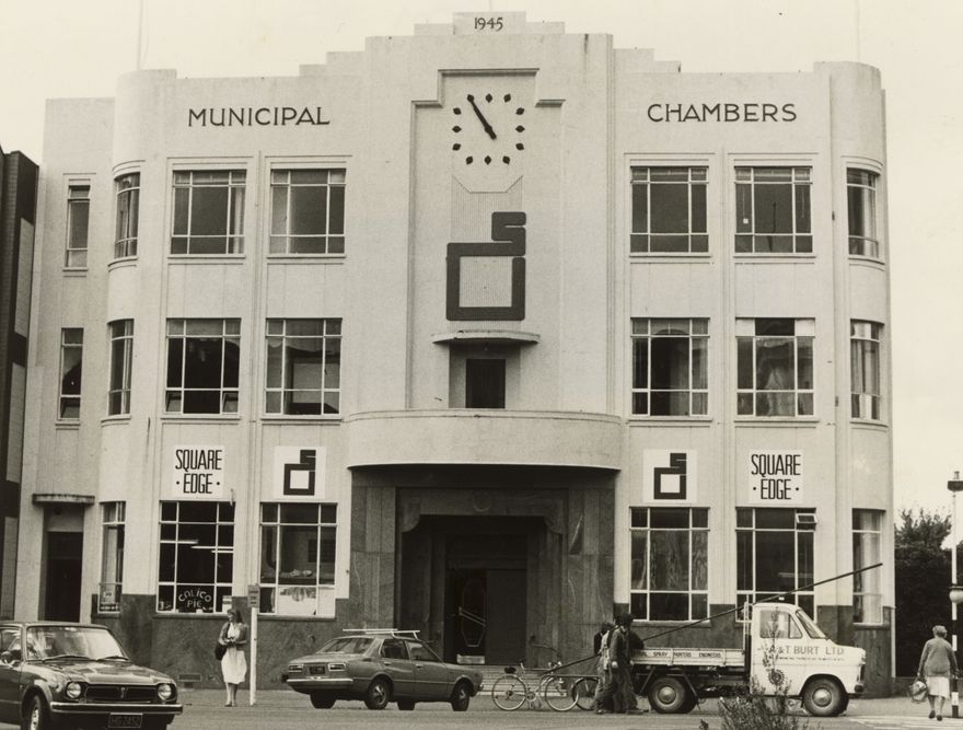 The old Municipal Chambers became an arts centre, known as ‘Square Edge’ when they were vacated by the Palmerston North City Council in 1980. The first tenant moved in January 1981. The Palmerston North City Council Municipal building was designed by Reginald Thorrold Jaggard and built in 1944-1945. The Council had occupied the same site in the former Colonial Bank of New Zealand building until it was demolished to make way for their new offices. The new building retained the 1924 addition, containing the Council Chamber, at the rear.