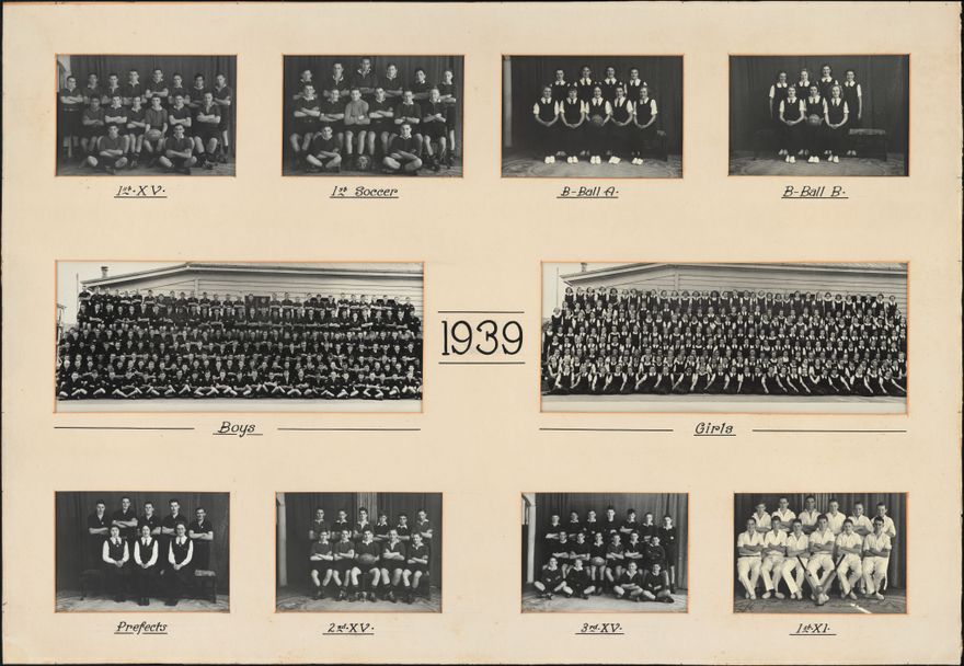 Photo boards from Palmerston North Technical School (now Queen Elizabeth College) displaying the school Prefects, Soccer, Cricket, Netball and Rugby teams, and female and male pupils.