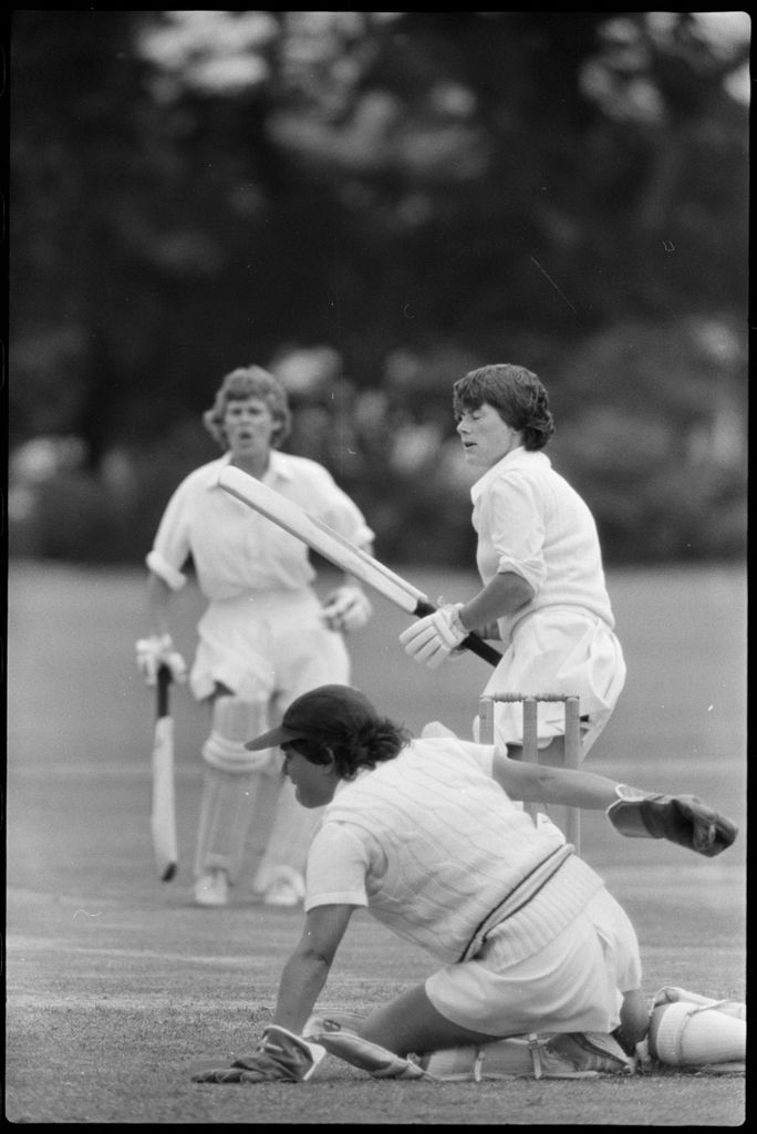 Penny Kinsella and Lorraine Vincent at bat. This image was taken (but not used) by the Evening Standard on 19th of January 1982. It depicts Manawatū Women’s cricket team taking on the International Australian Women’s team in a limited over warm-up match for the Hansell's Vita Fresh Women's World Cup 1981/1982. The match was held at Ongley Park in Palmerston North. The Australian team won by 202 runs. The match report ‘Aussies too polished in all facets’ was written by Ford Watson and published the next day: