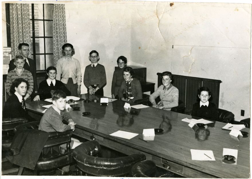 Children's Book Week at Palmerston North Public library. At the head of the table is Tina White, (Chairwoman of the Youth Committee), David Trudgeon (Chief Librarian), and Fay Jewell (Children's Librarian). The remaining individuals are unidentified.