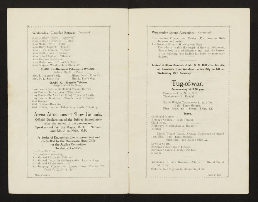 This booklet was produced by the Palmerston North Borough Council to commemorate the 1927 Jubilee. It details a week's worth of special events that took place all about Palmerston North, including an electric light show, a baby show, jazz night, fireworks display and lantern parade.