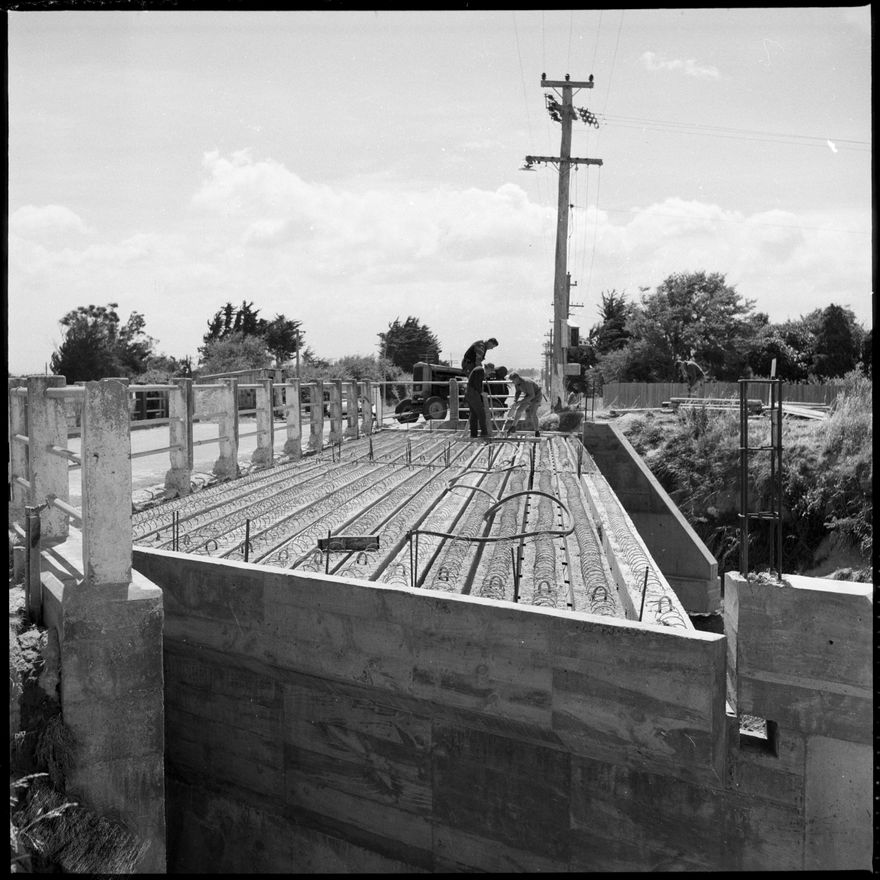 This image was taken for a story that ran in The Manawatu Evening Standard on 25th January, 1963. "The widening of the bridge over the Mangaone Stream in Tremaine Avenue, Palmerston North, is making rapid progress toward completion."