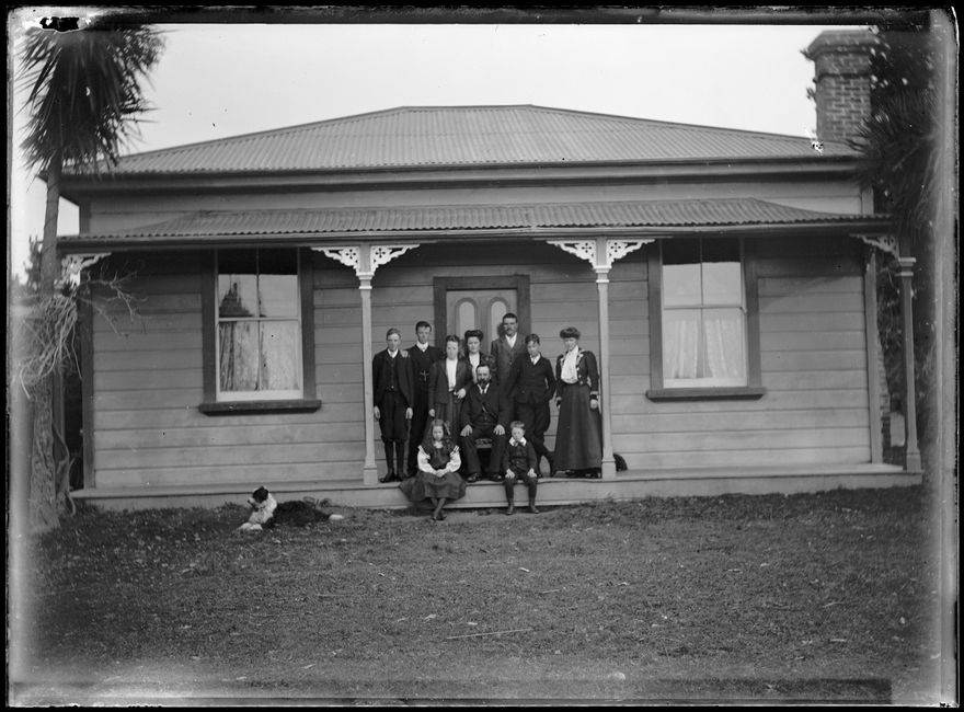 This photograph was created by William James Young in the early 20th century. A large variety of subjects are depicted in the collection, but family, rural life and travel are the most prominent themes. The exact location of the photographs in the Young Collection is unknown, but W J Young lived on a farm in Mt Stewart, Rangitikei, and some of the photographs include his house. The Young family were apparently avid travellers and photographs later in the collection feature scenes from Rotorua, Auckland, Whanganui, as well as other unidentified locations. The portraits are all unidentified, but are presumably of members of the Young family. The photographers parents were George Henry (b 1833) and Jane McDowell (b 1842, d 1916). They came to New Zealand in 1877. The same year, they bought the home farm on Mt Stewart and called it Kilrudden after Kilrudden House, the home of the McDowell family in Ireland. The couple had four children: Ann (b 1873), Margaret (b 1876), John (b 1878) and William James (b 1880). William James married Mary Elizabeth Thompson and they had four children: Doris (b 1914, d 1989), George (b 1916, d 1991), Royden McDowell (b 1925, d 1992) and Noel William (b 1927, d 2013).