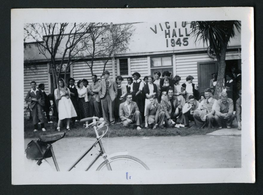 Members of the St Andrew's Presbyterian Bible Class attended the Labout Day rally in Marton. Identified people - Kneeling in front: Bevan Hawley; Unknown; Ken Osborn; Bill Stewart; Sam Lowery. Others standing: Jean Brown (white dress and head covering); Peter Baillie (hands in pockets) next to Jeanette Baillie, his sister; Isabel Pilkinton and Elayne Thompson behind unknown and Ken Osborn.