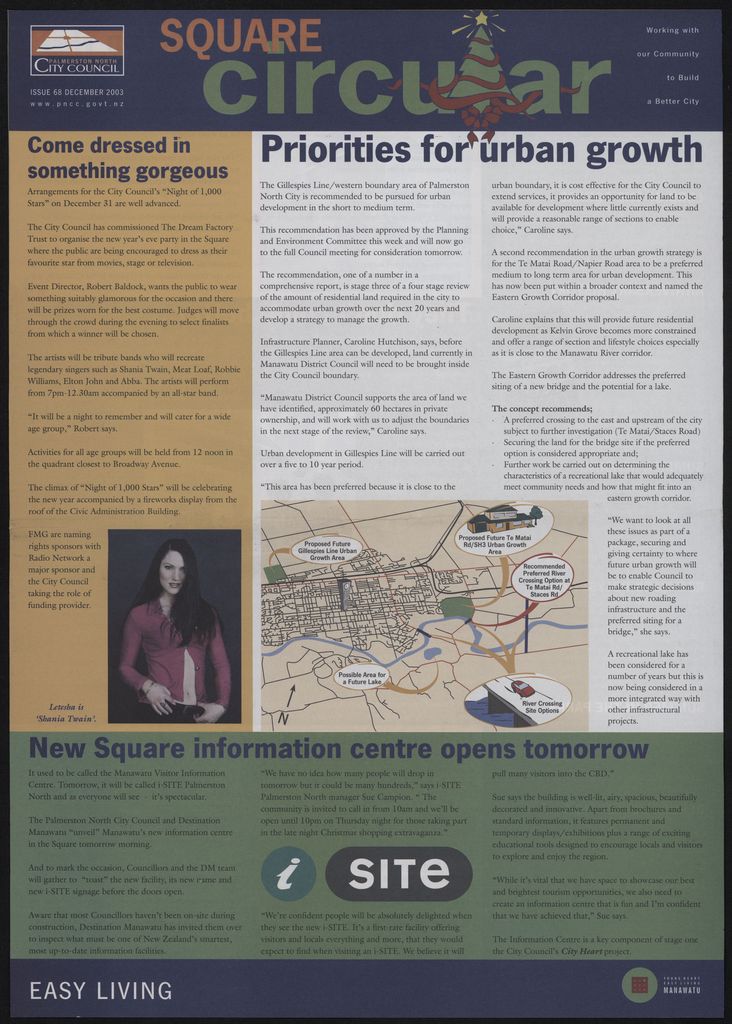 The Square Circular was Palmerston North City Council's monthly community publication, informing Palmerstonians of PNCC initiatives, activites, and events. This month's issue includes: New year's eve party; Christmas in The Square; information centre; City Heart; urban development; Gillespies Line; population; summer reading programme; library; Roslyn library; parks; Turitea Reserve; Youth One Stop Shop; Rangiora Community Centre; Highbury Whanau Centre; environmental health services; recycling; waste management.