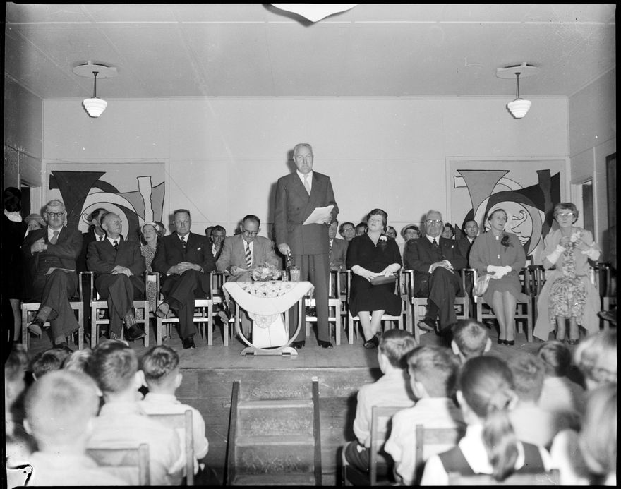 This image was taken for a story that ran in The Manawatu Evening Standard on 18 December 1958: "The official party at the annual breaking-up and prize-giving ceremony of the Palmerston North Intermediate Normal School yesterday. From left to right: Messrs. G. Bertram (chairman of the Parent-Teacher Association), H. Hall (senior inspector), W.H. Brown (chairman of the Wanganui Education Board), B.G. Jackson (headmaster), L.E. Simmons (chairman of the school committee), Miss J. N. Wallace (the guest-speaker), Mr. W.B. Tennent, M.P., Mrs. Jackson and Mrs. F. Goodall (the retiring first woman assistant)."