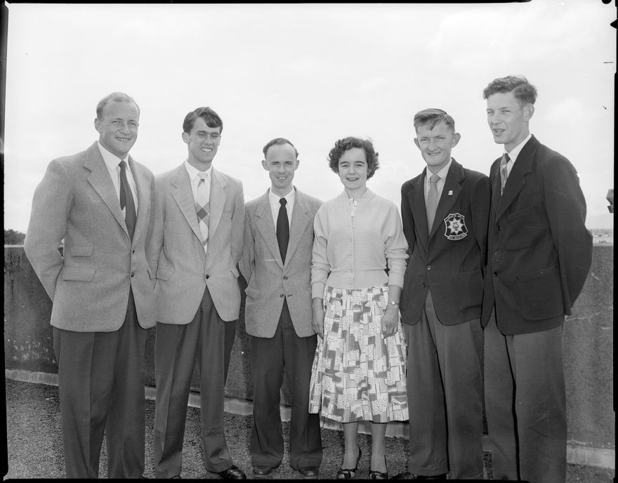 This image was taken for a story that ran in The Manawatu Evening Standard on 10 December 1958: "These candidates were successful in their pharmacy examinations. They are (from left to right): Messrs. E.C. Seville (passed final in pharmacy), B.A. Wilde (passed botany), C.A. Tucker (final in pharmacy) Miss B. Birch (final in pharmacy) and Messrs. W.A. Morrison (final in pharmacy) and I.B. Allott (passed botany)."
