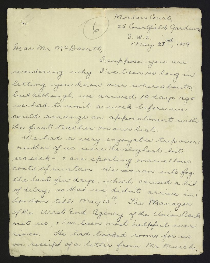Letter from Mrs Margaret Loveday to Mr McDavitt telling of her and her son, Alan's, arrival and early days in London. Alan Raymond Loveday was born 29 February 1928 in Palmerston North, to Margaret (nee Rickard) and Leslie Loveday. Playing the violin from an very early age, a local benefit concert was held to raise funds to send the 11-year-old Alan with his mother Margaret to the UK for violin lessons, where he became a pupil of Albert Sammons. He married pianist Ruth Stanfield in 1952, and they had two children Rosalind and Ian. Alan Loveday had a distinguished career as a violinist, including being a professor at the RCM. He died 12 April 2016.