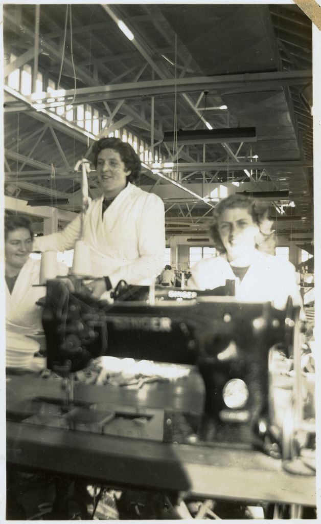 Three women sit behind sewing machines at the Libertyland Factory, Palmerston North. R W H Symington and Co. (N Z) Ltd first established themselves in New Zealand in 1934. Specialising in corsetry and underwear manufacturing, a small factory was built in Palmerston North in 1937, and the main "Libertyland " factory was completed and opened in 1946. The company was acquired by Courtalds Pty (UK) in 1965 and then in 1990 became a wholly owed subsidy of Lane Walker Rudkin (LWR) lndustries Ltd, New Zealand’s largest textile garment company. Libertyland closed to business in July 2009, and was demolished in 2012.