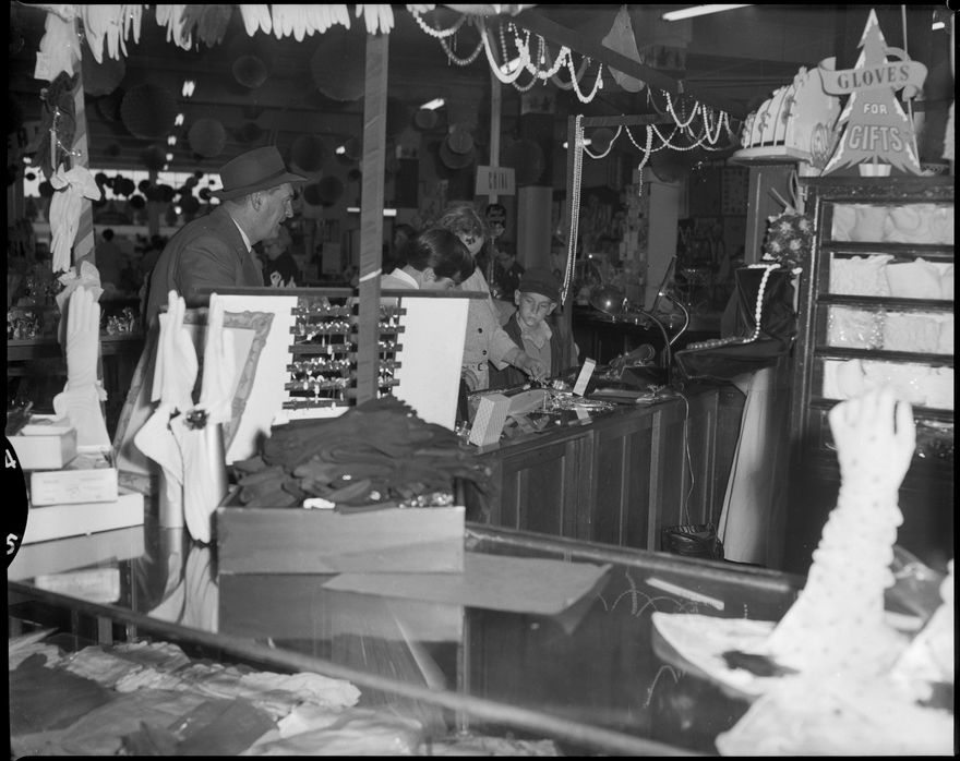This image was not published in The Manawatu Evening Standard, taken on unknown date. Unknown retail store promoting gloves for gifts.