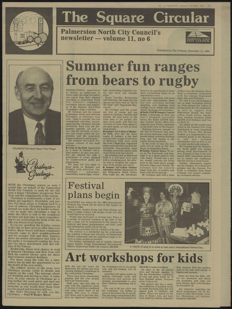 The Square Circular was Palmerston North City Council's monthly community publication, informing Palmerstonians of PNCC initiatives, activites, and events. This month's issue includes: Paul Rieger; Michael Willis; Summer get-a-bout programme; library; art gallery; Coleman Place; swimming pool fencing; waste management; International Festival Day; art workshops; Lido; colonial cycle classic; infrastructure maintenance; aviary; meetings.