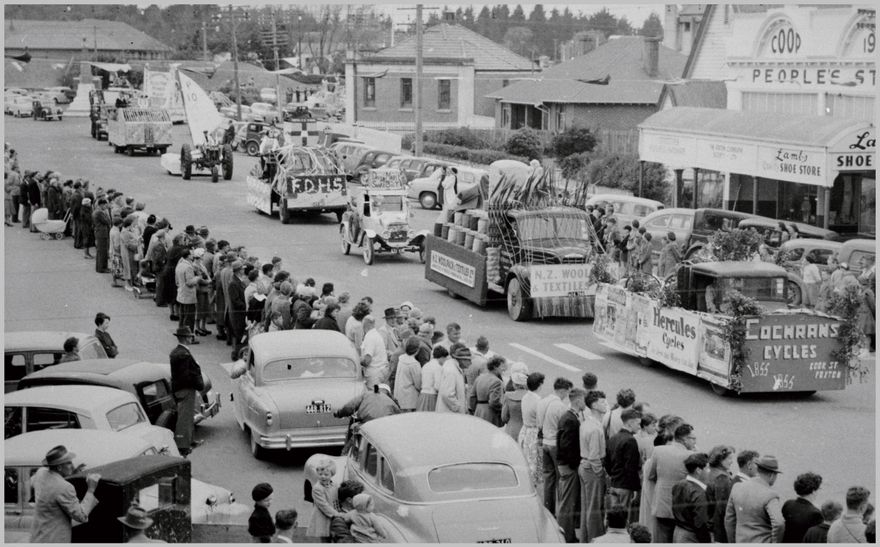 Floats involved in the Foxton Centenary procession (right to left): Cochran's Cycles (1855), Cook Street, Foxton; N.Z.Woolpack and Textiles Ltd.; Dave and Mabel from Snake Gully; Foxton District High School; a P10 catamaran with a 3 wheel tractor pulling it.