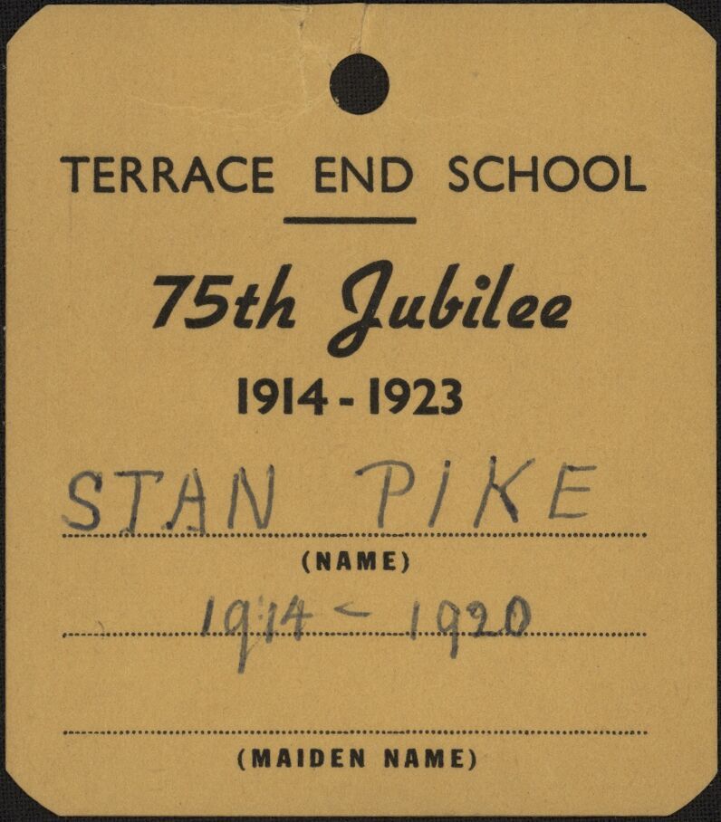Name tag of Stan Pike who attended the Terrace End School jubilee in 1959. He attended Terrace End School during the period 1914 - 1920.