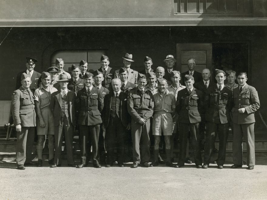 The Mayor of Palmerston North, A. E. Mansford, (fifth from left in the back row), Councillors, offical staff and visiting Australian Airmen at Ohakea during World War II.