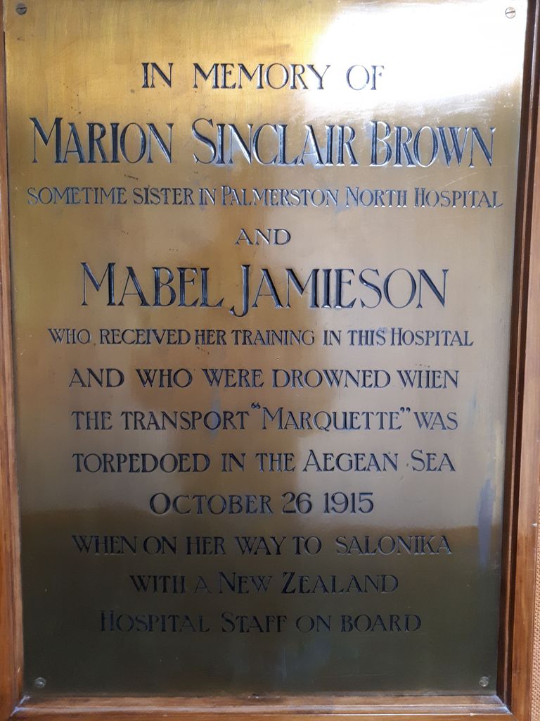 Plaque to Mabel Jamieson and Marion Sinclair Brown who drowned on October 26 1915 when the British transport ship SS Marquette was torpedoed in the Aegean Sea. Mabel and Marion were among 10 members of the New Zealand Army Service killed. Private Clarence Perrin of Palmerston North also died and three Palmerston North bank clerks were among the Ambulance Corp rescued from the boat. This plaque is in the Education Centre of the Palmerston North Hospital.
