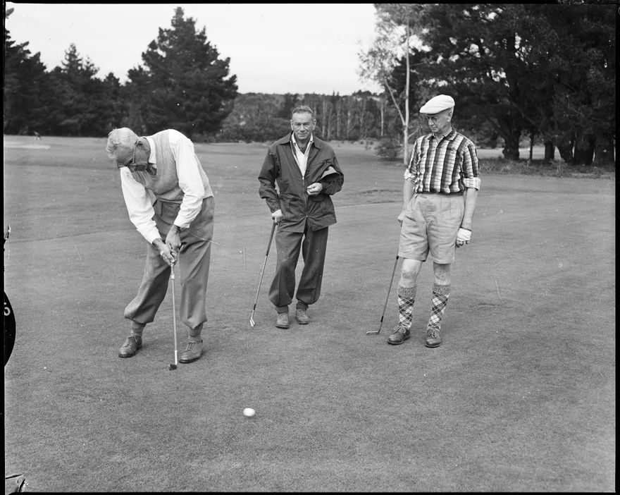 This image was taken for a story that ran in The Manawatu Evening Standard on 15 April, 1959. "C. Harris (Manawatu) centre and S. McDowall (Feilding) look on as G. E. Cutfield (Manawatu) putts during the first round of the Manawatu veterans' annual golf tournament which was played on the Hokowhitu links. Upwards of 50 veterans are competing in this year's tournament."
