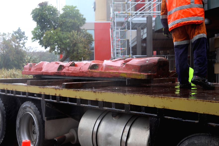 Pou whenua being removed from Te Marae o Hine side of Palmerston North City Council building for renewal and refurbishment by Detlef Klein. Installed in 1990, the 3 carvings resemble Rangitāne and his grandmothers, Reretua and Hinerau. The pou were removed to be dried out in storage and restored, with a return date of 2020.