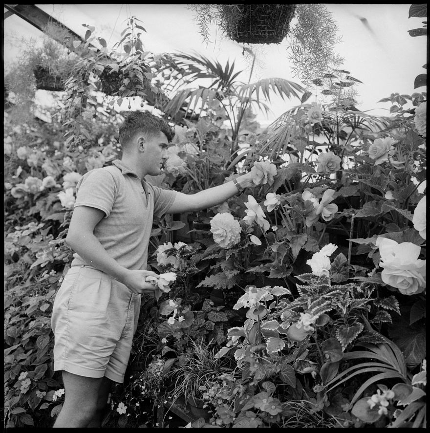 This image was taken for a story that ran in The Manawatu Evening Standard on 17 January 1961: "With the winds experienced in the city last night and today many house gardeners shudder at the damage done. On the brighter side, the begonia house at the Esplanade is untroubled by winds or weather. Pictured is Mr. M. Martin doing the usual early morning tidying up around the glasshouse. Mr. Martin, a student of the Palmerston North Boys' High School, working his school holidays, hopes when leaving school to study horticulture and take a degree."