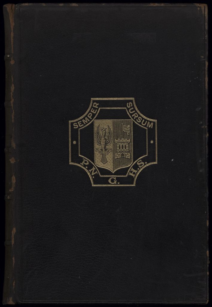 Emblem of PNGHS that was stamped on the cover of a book award. The book was 'The Surgeon's Log' by J Johnston Abraham and was awarded to Thelma Pink for "General good work and progress", in December 1925. Semper Sursum is Latin for 'always aim high'.