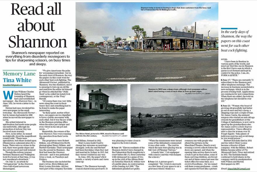 Journalist Tina White's weekly "Memory Lane" article in the Manawatū Standard. The early days of long-gone newspaper "Shannon News" and a selection of its articles in June 1921.