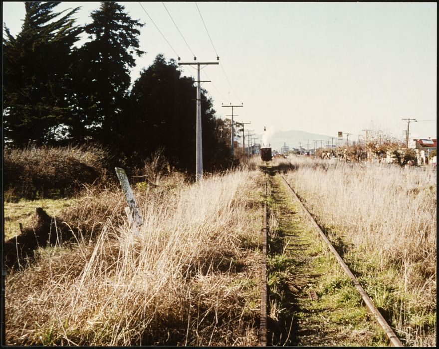 Former railway tracks sited next to Pioneer Highway, near Botanical Road. The railway moved to the outskirts of Palmerston North in the 1960s. The train that can be seen was removing the tracks.
