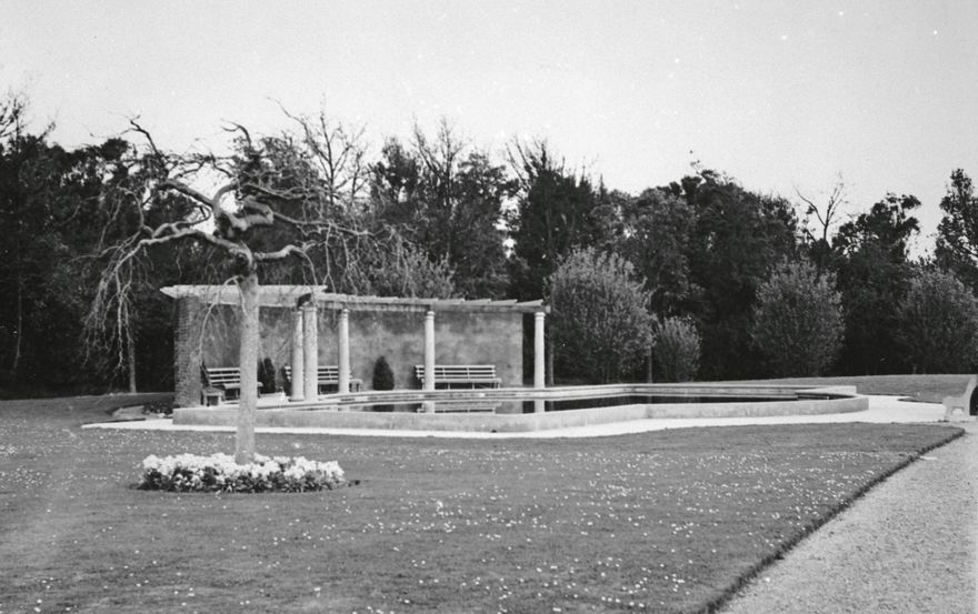 Shown here is the paddling pool in the Esplanade, paid for by the Returned Servicemen’s Association and presented to the children of Palmerston North in 1937. The paddling pool was presented to the children of Palmerston North by the local Returned Servicemen's Association branch, in 1937. It was built in the shape of an RSA badge, with art deco features.
