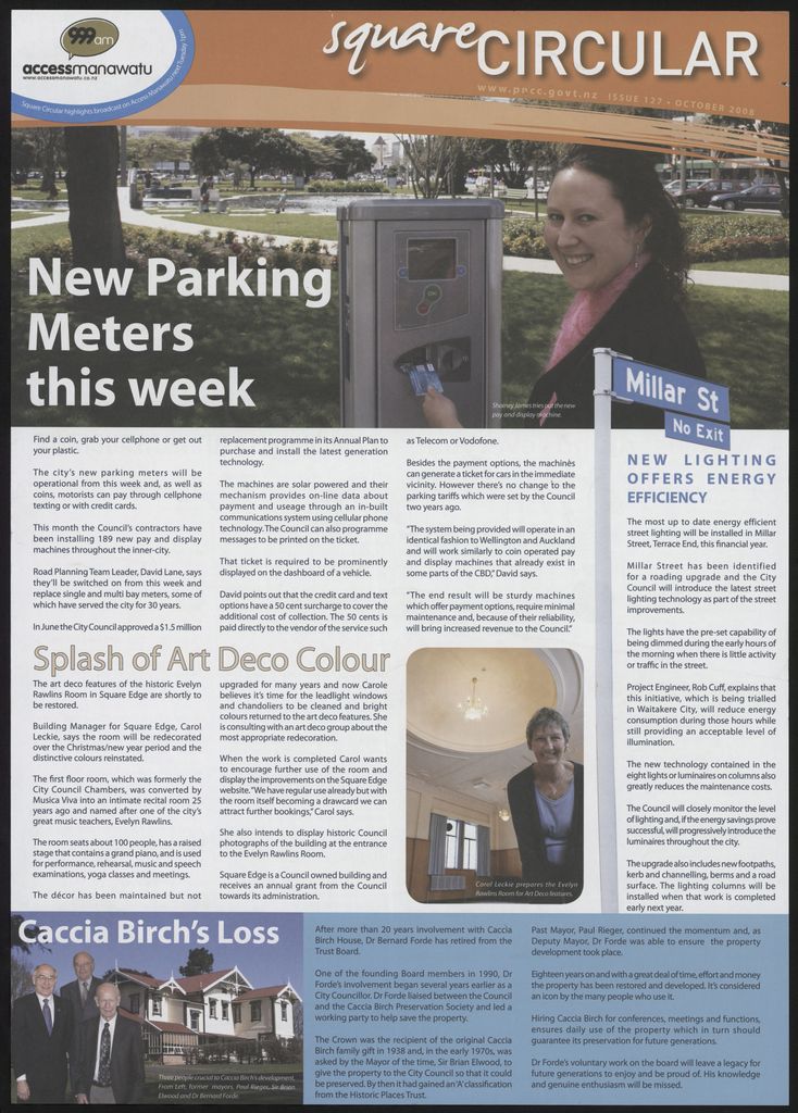 The Square Circular was Palmerston North City Council's monthly community publication, informing Palmerstonians of PNCC initiatives, activites, and events. This month's issue includes: parking meters, Square Edge, street lights, Caccia Birch, Dr Bernard Forde, access way by Aokautere Shopping Centre, community consultation, The Regent, Business Friendly Strategy, Elaine Reilly, gambling venues policy review, parking team Heads Up cards, call centre, Youth Council, Pit Park, Jaycee Trust Scholarships, community events programme, Christmas parade, Centrepoint theatre, heritage buildings.