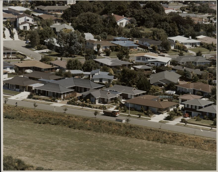 Aerial photograph of houses and properties on and around Centennial Drive.