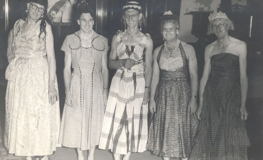 Male staff members dressed in women's clothing for a party held in the Rosco tearooms. Includes: Mr Edyvean (far right) and Mr P Mills. C M Ross Co. Ltd was one of the foremost department stores of Palmerston North and operated in The Square from 1883 until it was sold to Milne and Choyce in 1959.