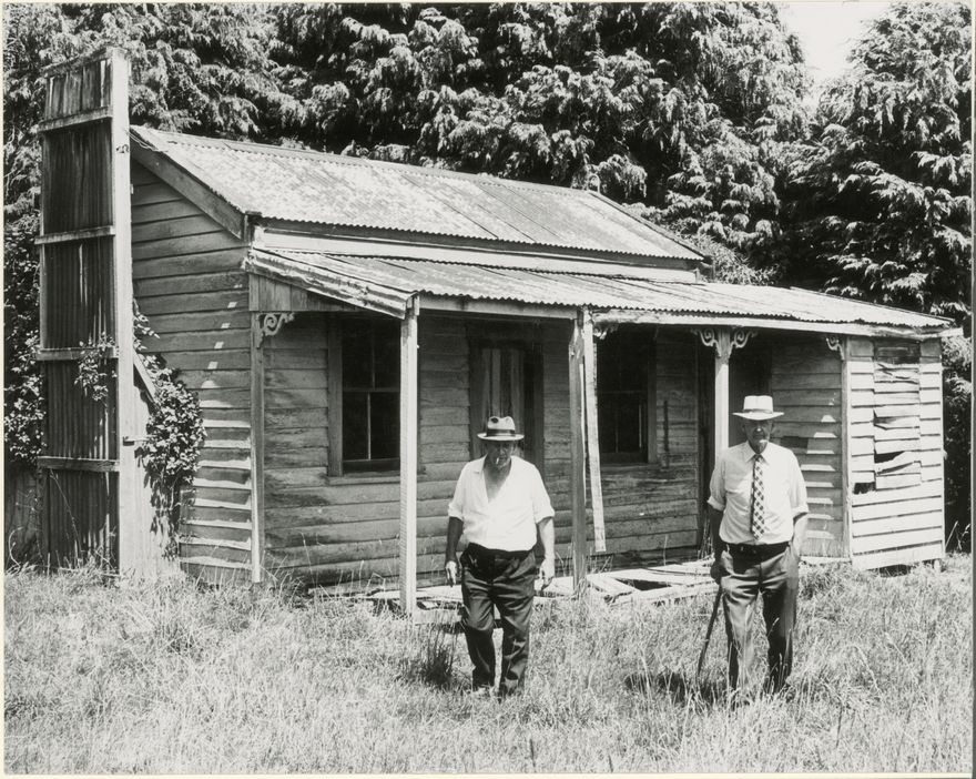 Jim and Tom Enright are standing in front of the house their grandfather Michael Enright built in 1896, 1 year after he and his father took possession of the 227 acres. The royal mail stables were eventually added on the left of the house and Michael (then postmaster) used the room on the right as the Post Office. The mail then had to be taken to Raumai first on horseback, later by horse and dray as roads improved. The Totara and Rimu cottage was home for Michael's sons and grandsons until the 1930s.