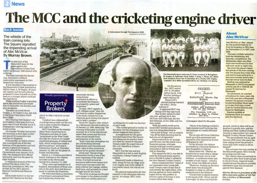 Local historians weekly "Back Issues" article in the Manawatū Standard. A detailed account and description of a cricket game in Palmerston North, 1930. The Manawatū team played the touring Marylebone Cricket Club from England. The local team included train driver Alexander (Alec) McVicar, who played 75 matches for Manawatū.