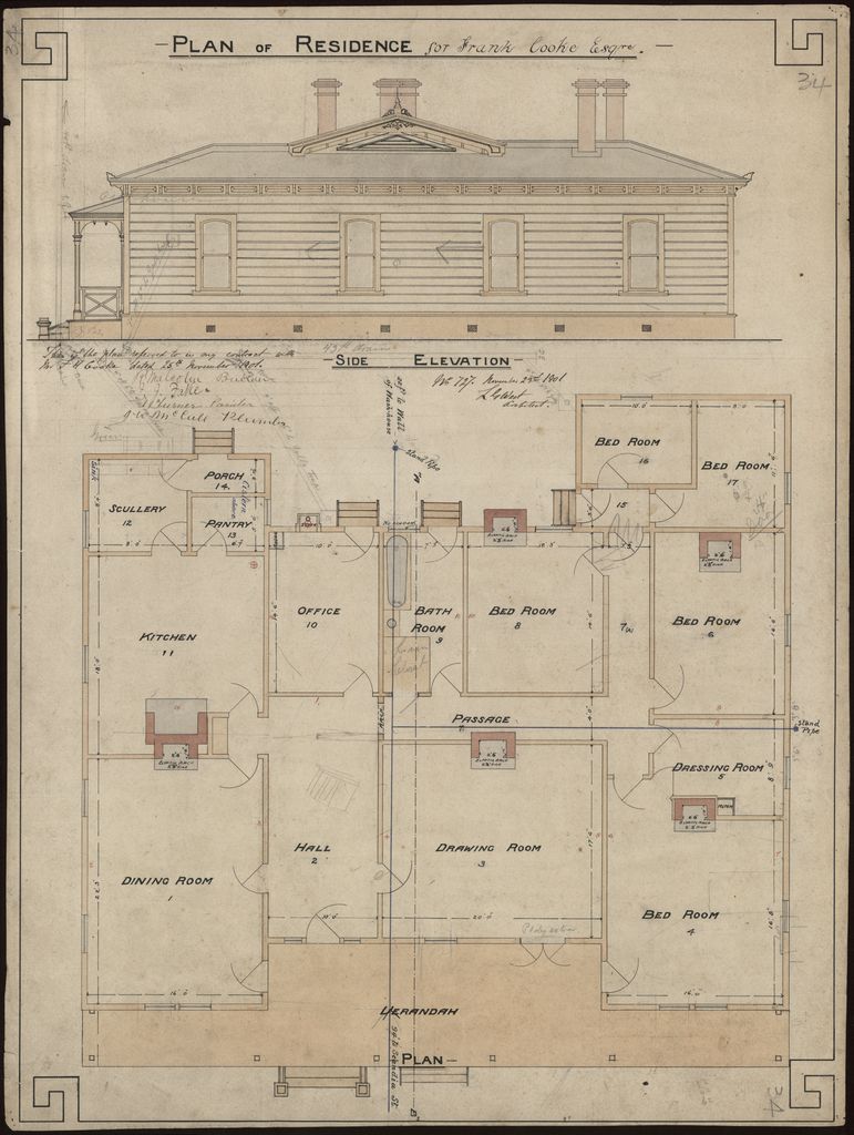 These plans for a single-storey, five bedroom house were designed by L. G. West for Frank Cooke. The Danish-born architect Ludolph Georg West (1846-1919) established an architectural practice in Palmerston North in about 1880. In 1912 he formed a partnership with is son, Ernest Vilhem West, who continued the business after his father's death.