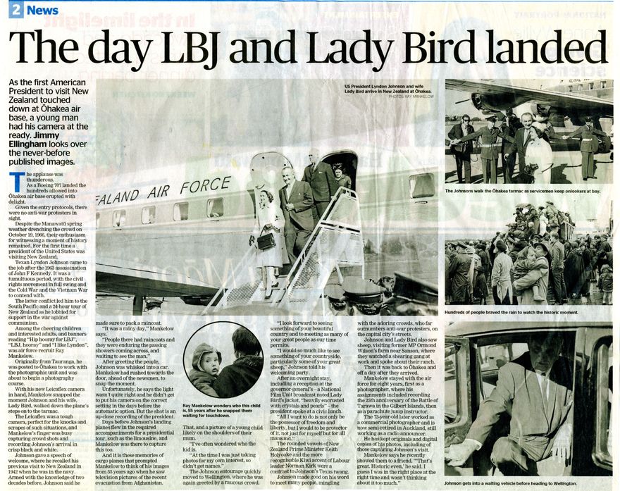 Manawatū Standard article. On 19 October 1966, US President Lyndon Johnson and his wife Lady Bird Johnson arrived at Ōhakea air base for the start of their New Zealand visit. Amongst the welcoming crowd was air force recruit Ray Mankelow, who captured historic photographs of the occasion.