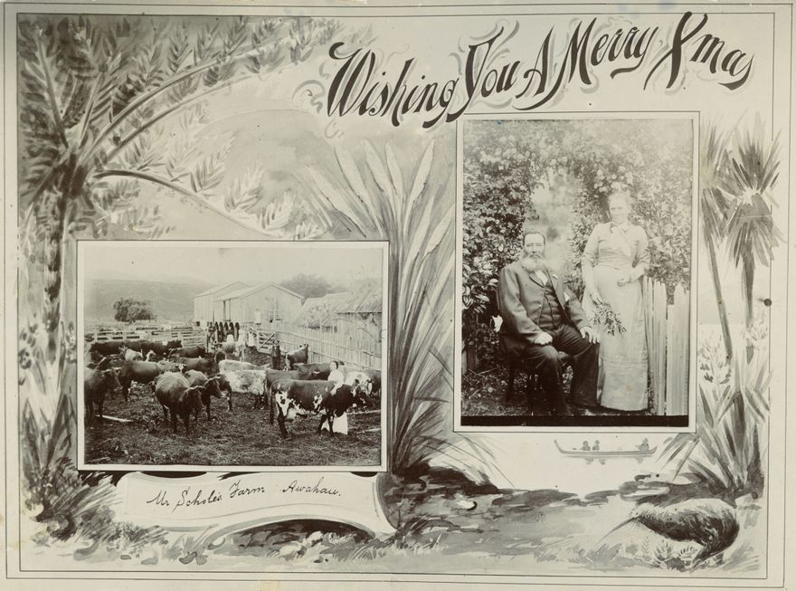 The left image shows a small herd of short horn Ayrshire cross dairy cows on Scholes' farm at Awahou in the Pohangina Valley. The image on the right is not captioned, but is presumably Mr and Mrs Schole.