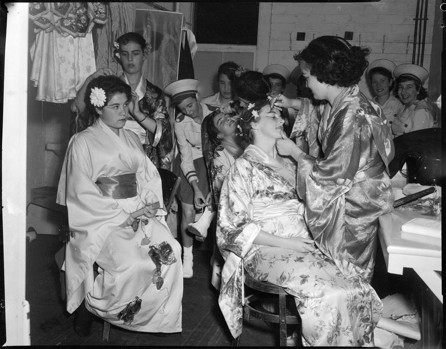 This image was taken for a story that ran in The Manawatu Evening Standard on 11 April 1958, page 11: "This section of the cast, who will be seen in the coming production of "Viktoria and her Hussar" are patiently submitting to authority as last-minute make-up adjustments are made to ensure overall perfection of their scene."