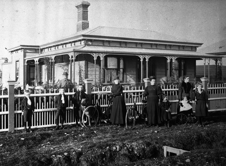 Dahl family outside their house in Duke Street (now Princess Street). People identified from left: Leslie Dahl, Norman Dahl, Charles Dahl (behind fence, with bowler hat), Charles junior Dahl (with dog), 2 unknown women (with bicycles), Pearl Dahl, Mrs Frederick Johansen (mother of donor), Theodore Dahl (on tricycle), Justine Dahl.